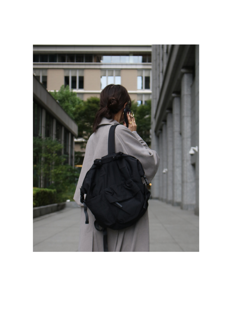 BAGミニマルな黒の2wayリュック:機能的でありながら、カジュアルすぎないものを。両手を空けてスマートに動ける、アクティブなキャリア女性の象徴です。
