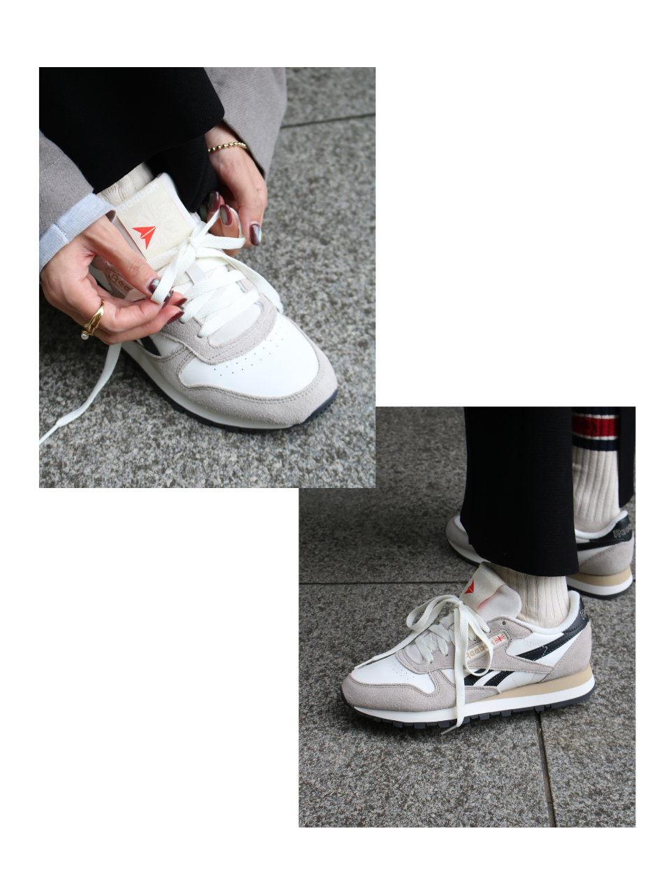 SHOES白ベースのハイテクスニーカー:トラッドなコートに対し、あえてボリュームのある「ダッド系」をON。このコントラストが、ベーシックな着こなしに最先端のモード感をプラスする鍵。