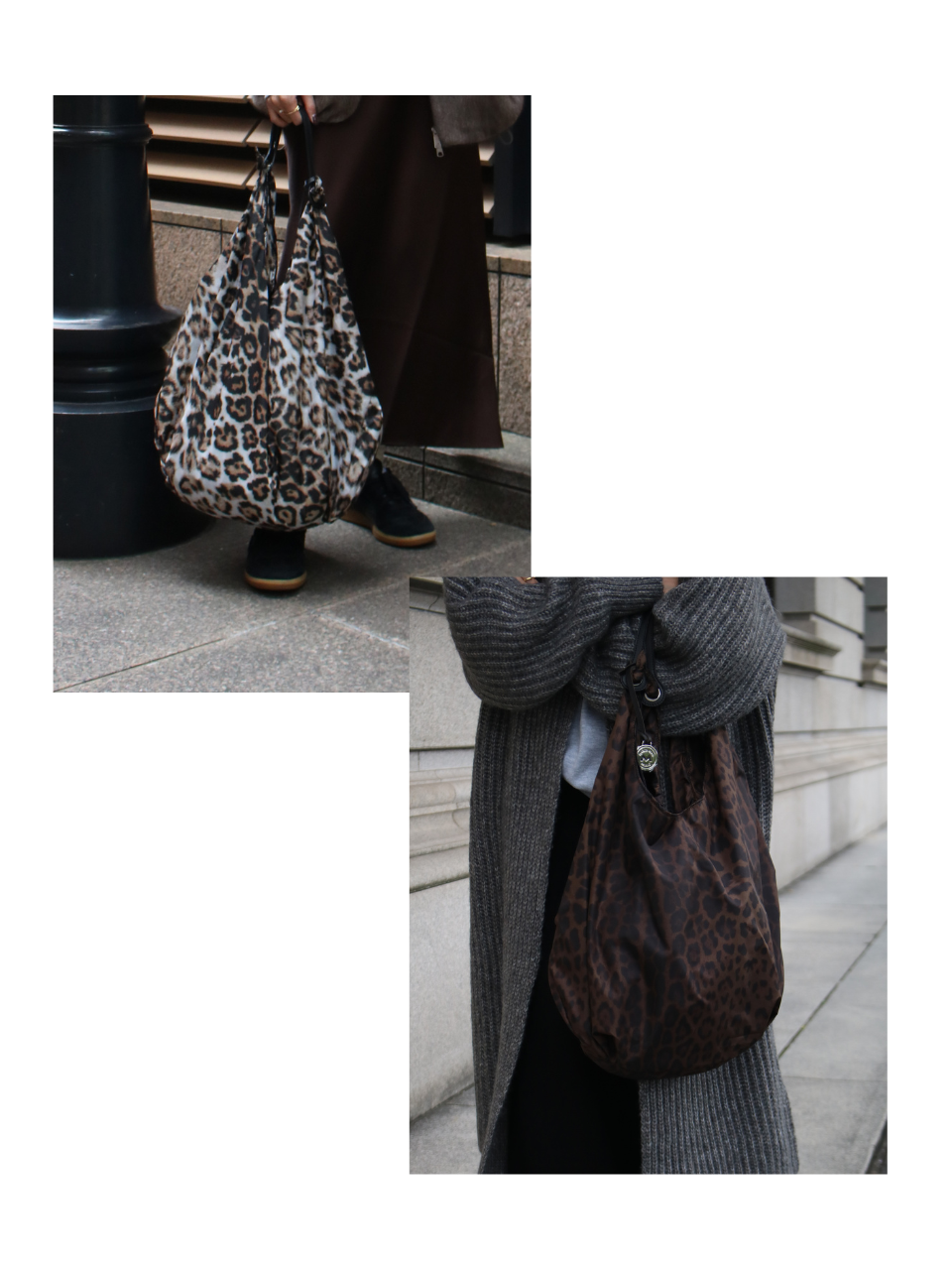 BAGレオパード柄のナイロンバッグ:シンプルな着こなしだからこそ、小物で大胆なトレンドをON。ブラウン系のレオパードなら、全身のダークトーンに自然に馴染み、感度の高さをアピールできます。