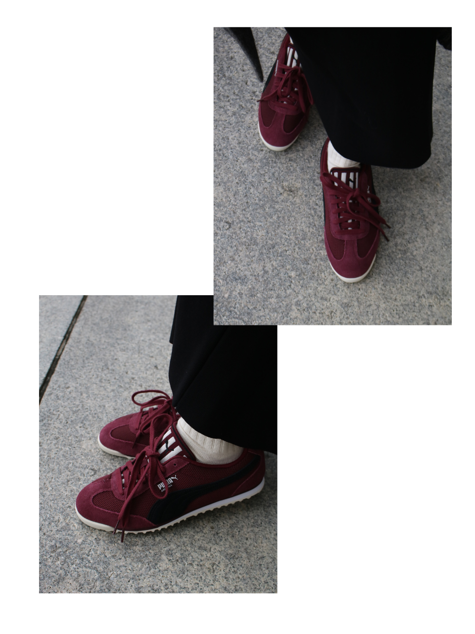 SHOESバーガンディのレトロスニーカー:クラシックなローカットデザインを選べば、ニットにも馴染みやすい。スエード素材とバーガンディ(深紅)の配色が、秋らしいシックな彩りを足元に運びます。