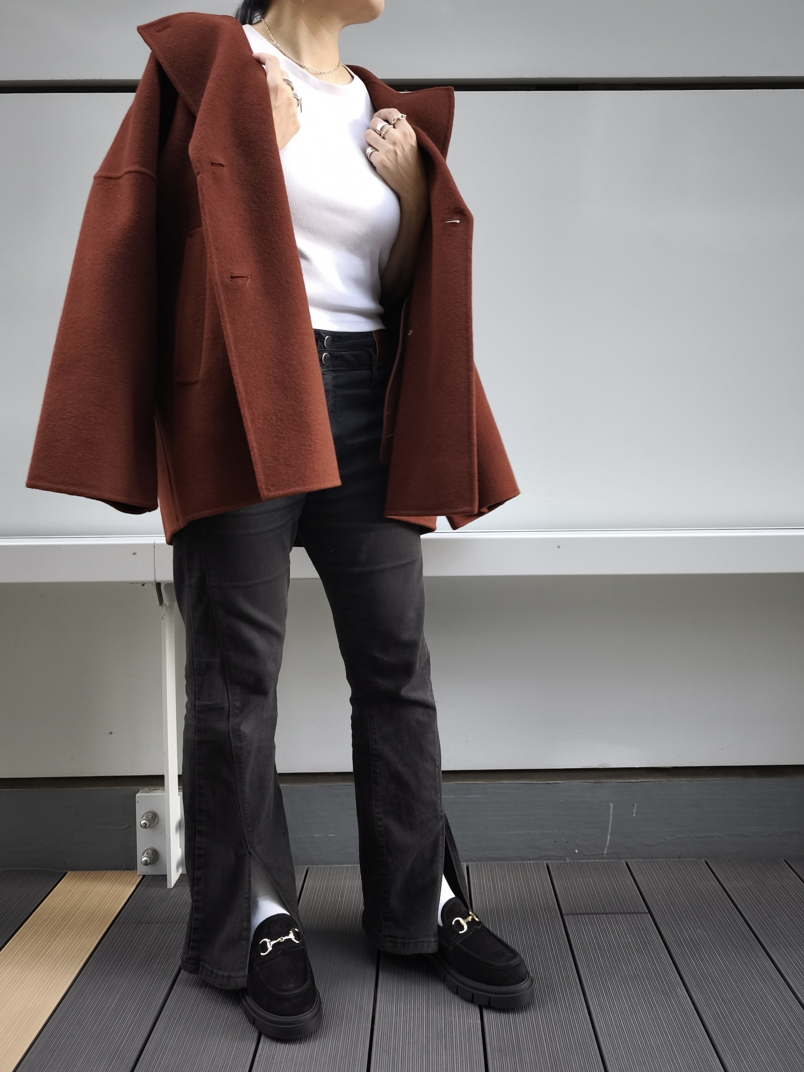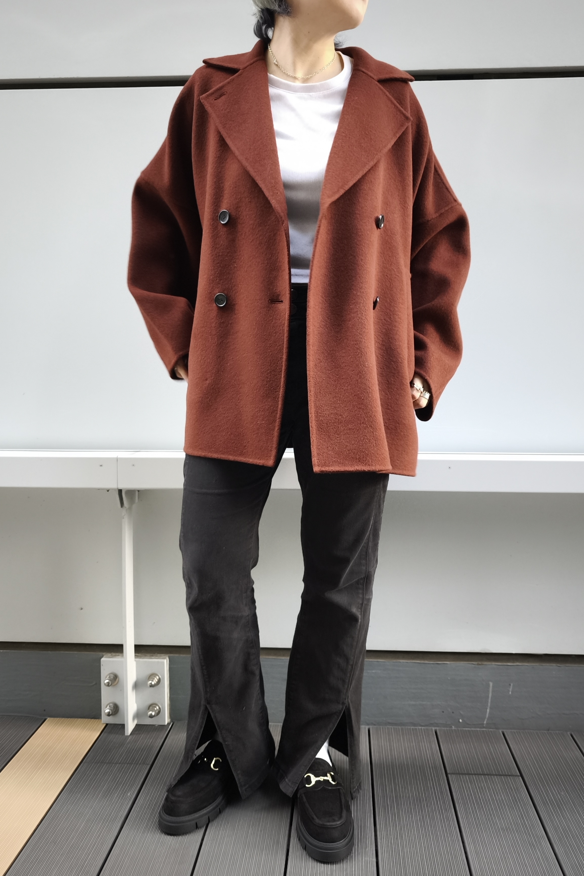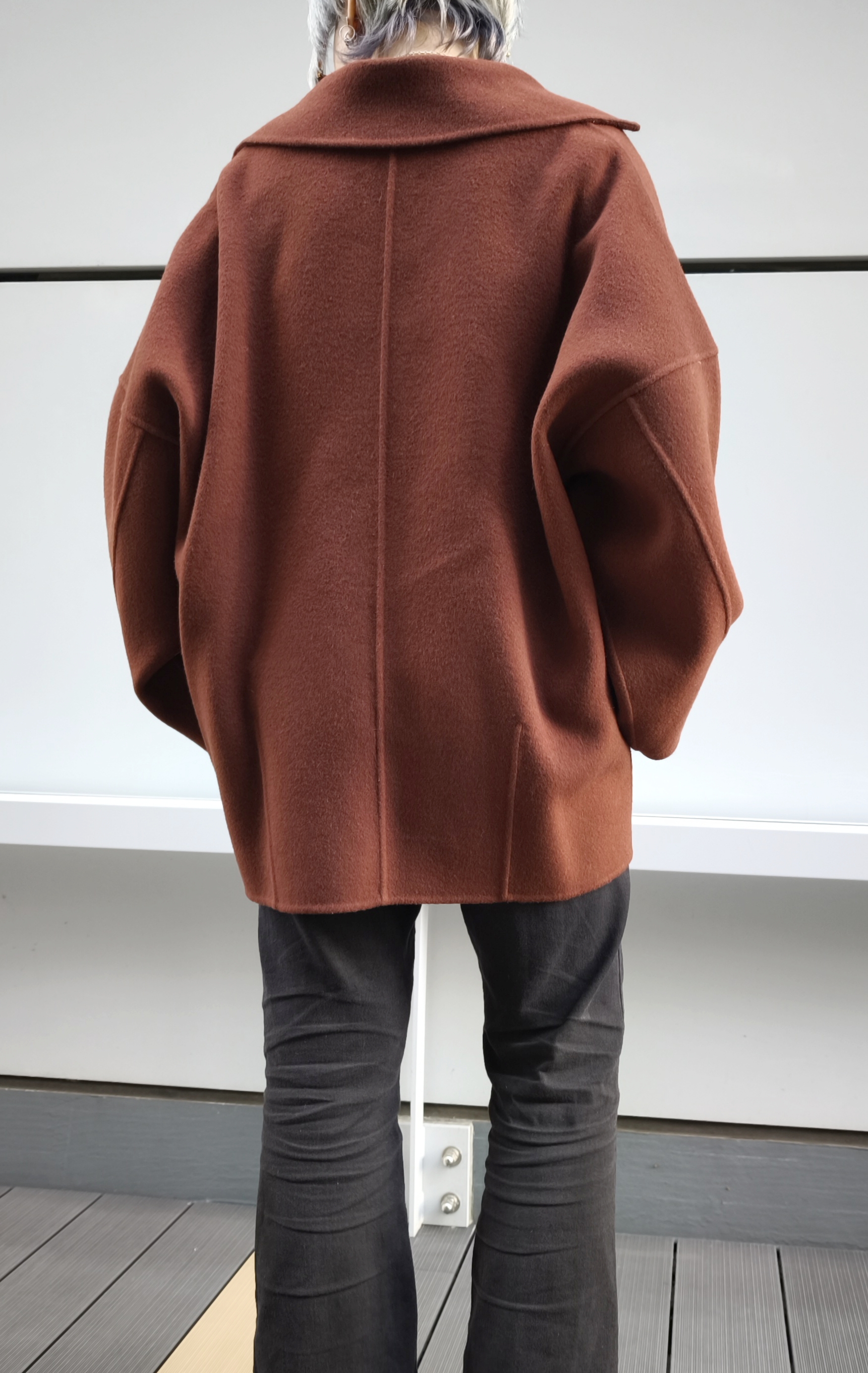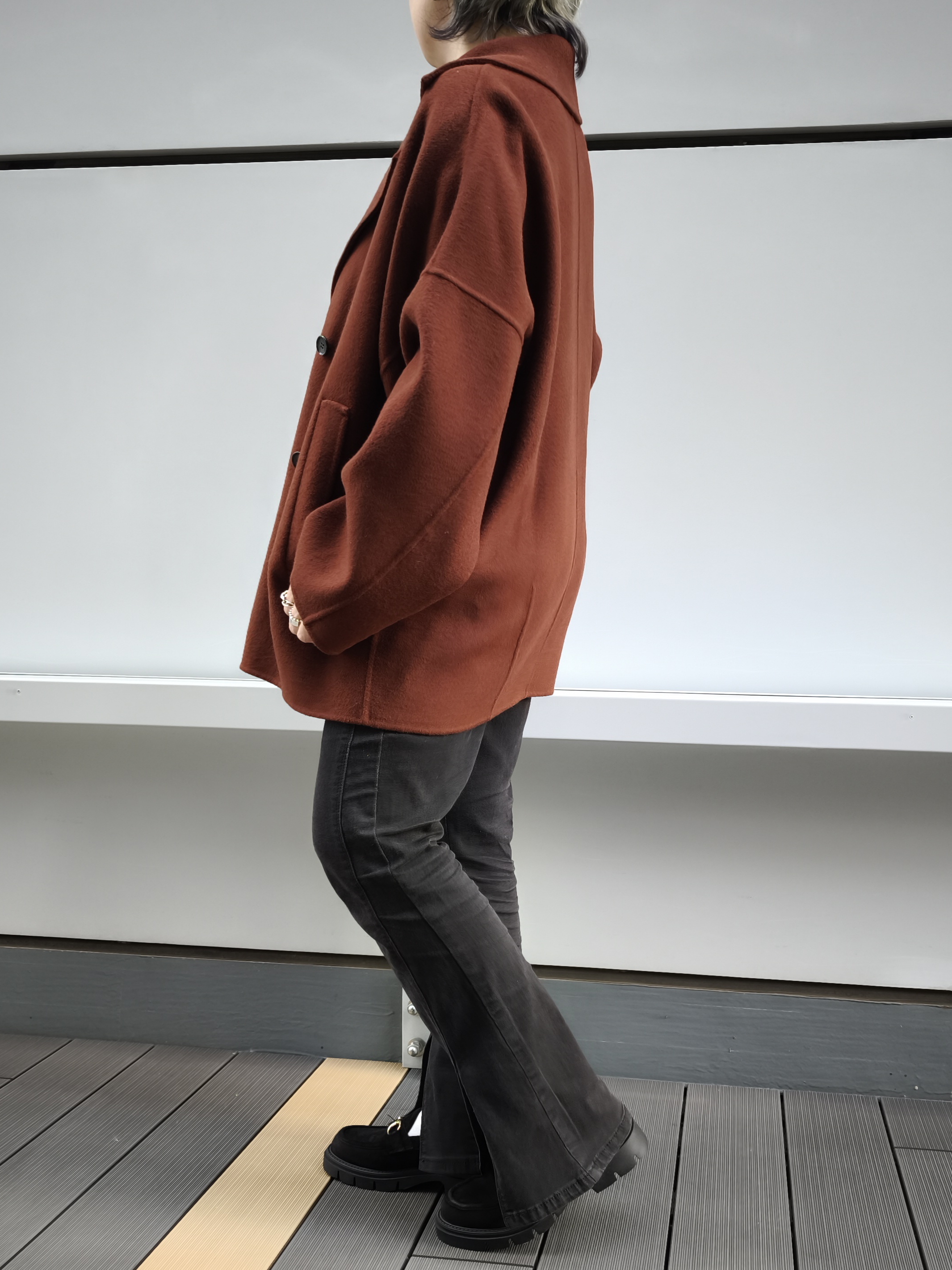 二枚のウール生地を縫い合わせたリバー仕立ての素材はしっかり暖かく、また、非常に軽やかです。