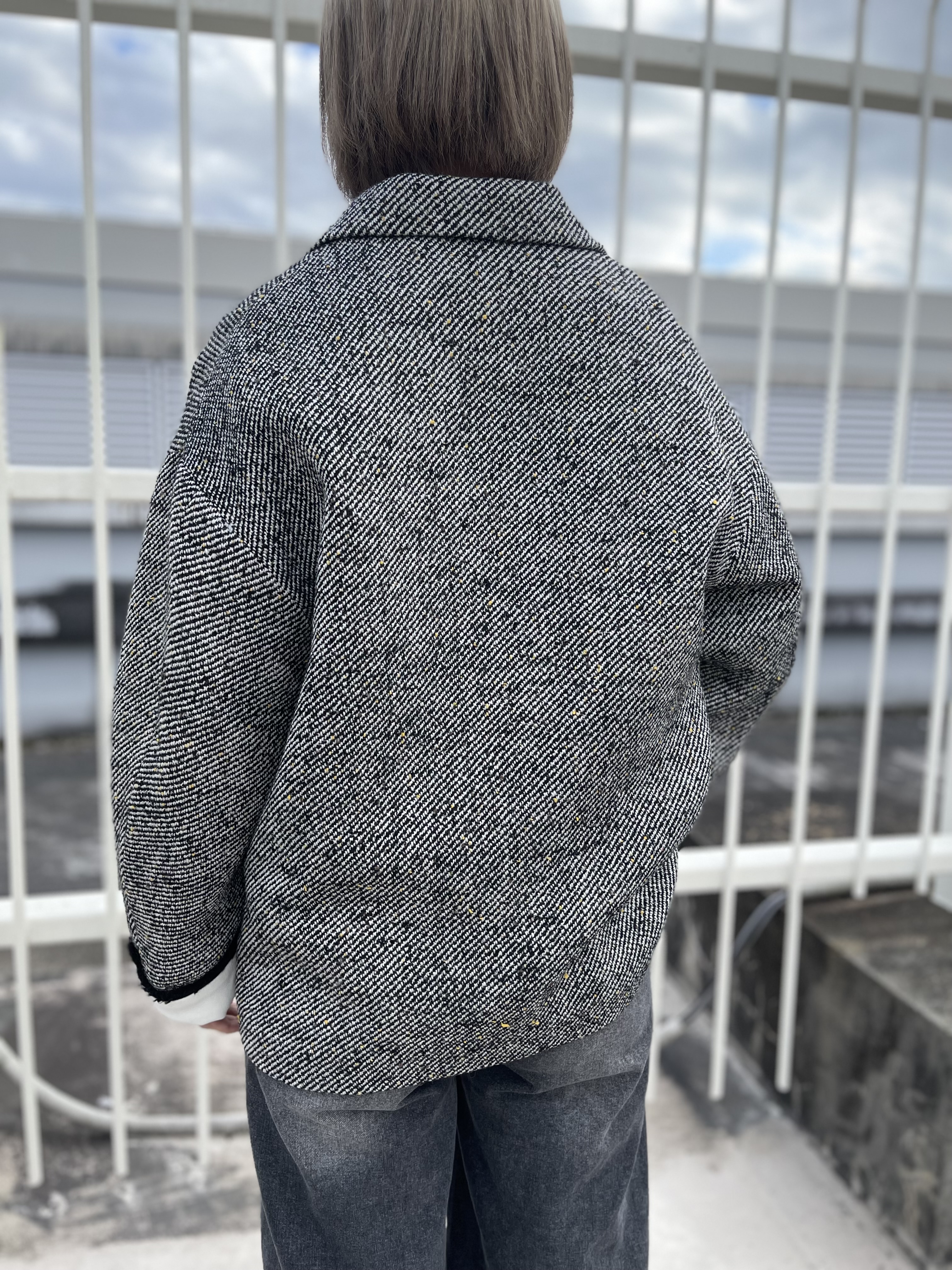 軽やかに羽織れるショート丈は、ワイドパンツやボリュームスカートとも好相性。コンパクトなシルエットが脚長効果を生み、スタイルアップにも。「ショート丈 × 大きめ襟」で、顔まわりも華やかに。