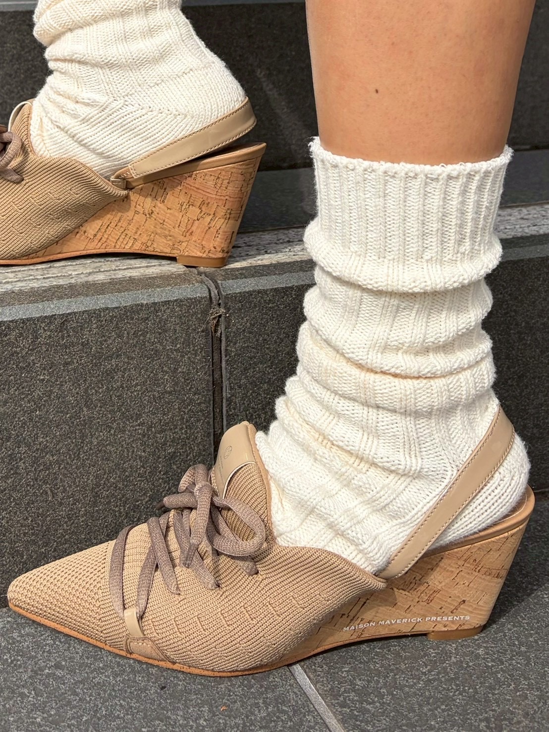 柔らかいニット素材のアッパーに、コルク調のウェッジソールを組み合わせたデザインで、